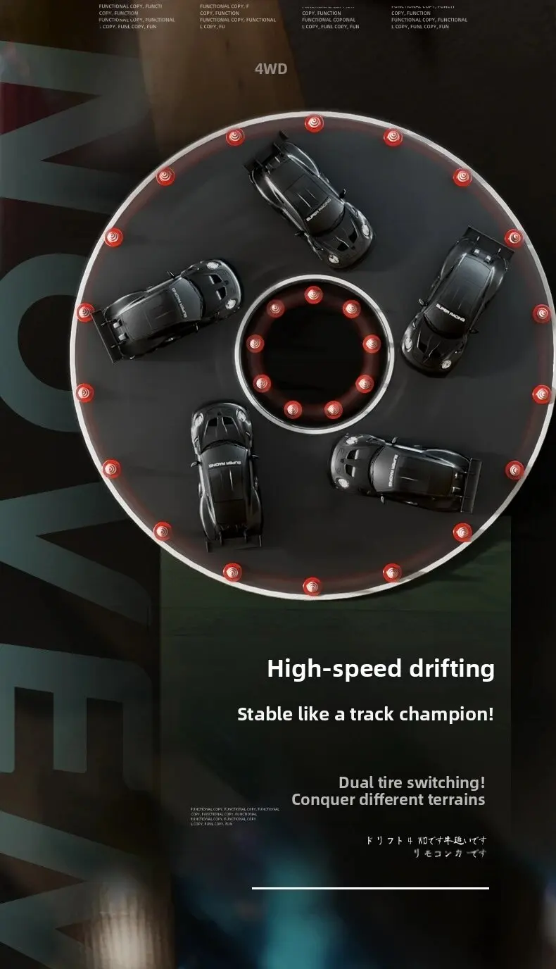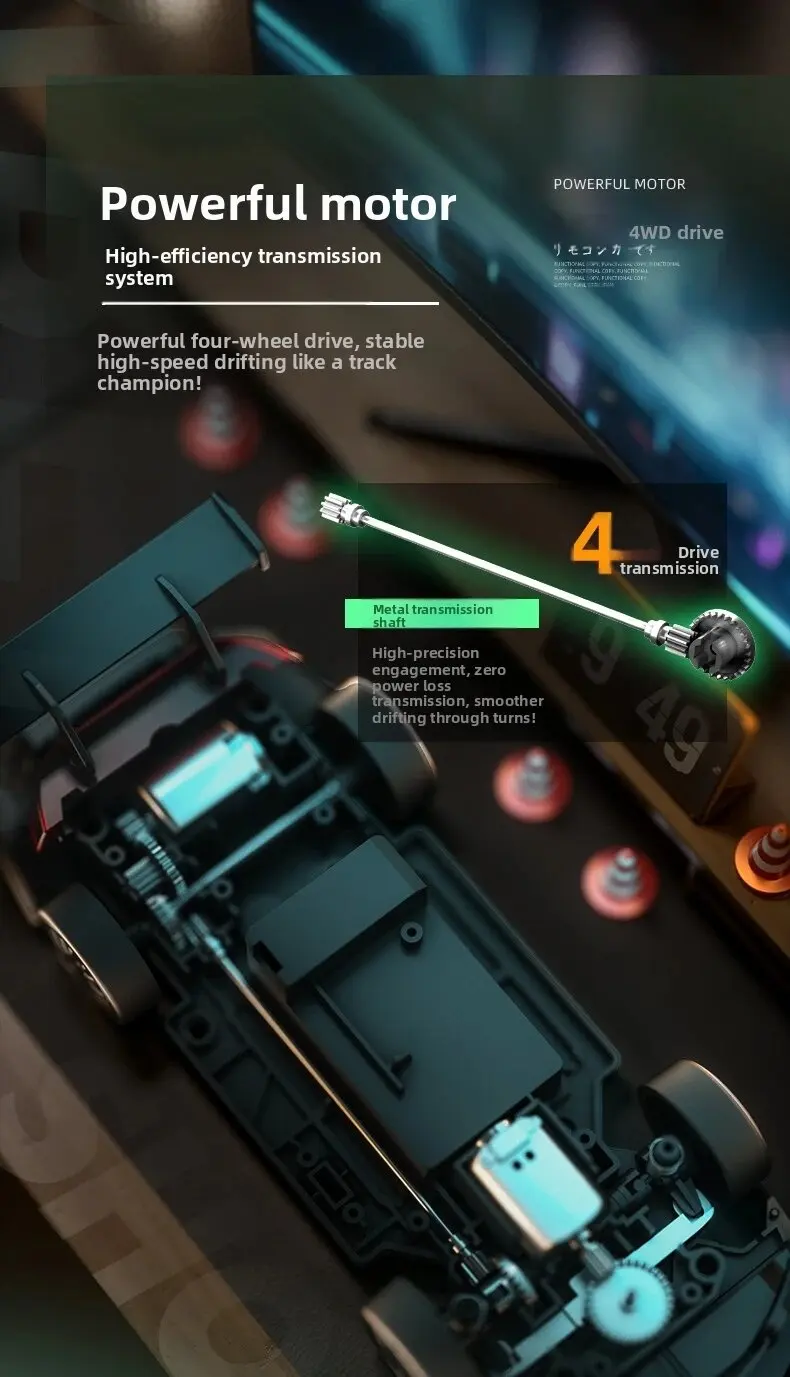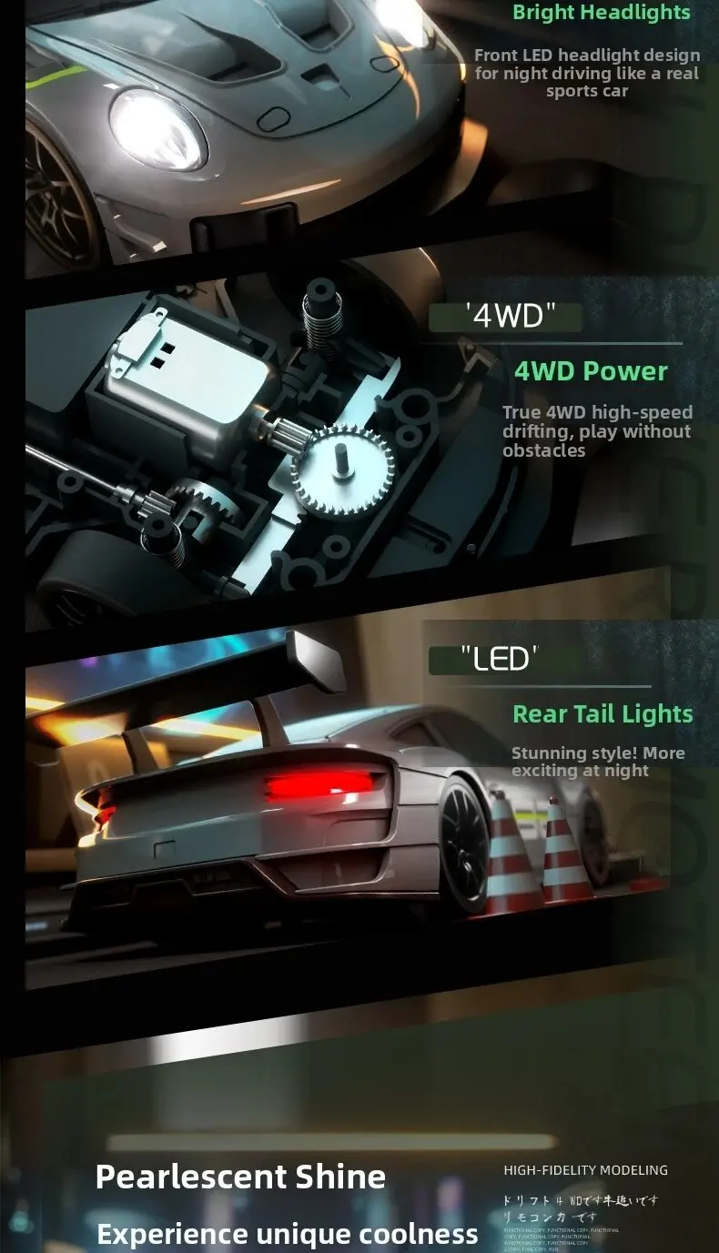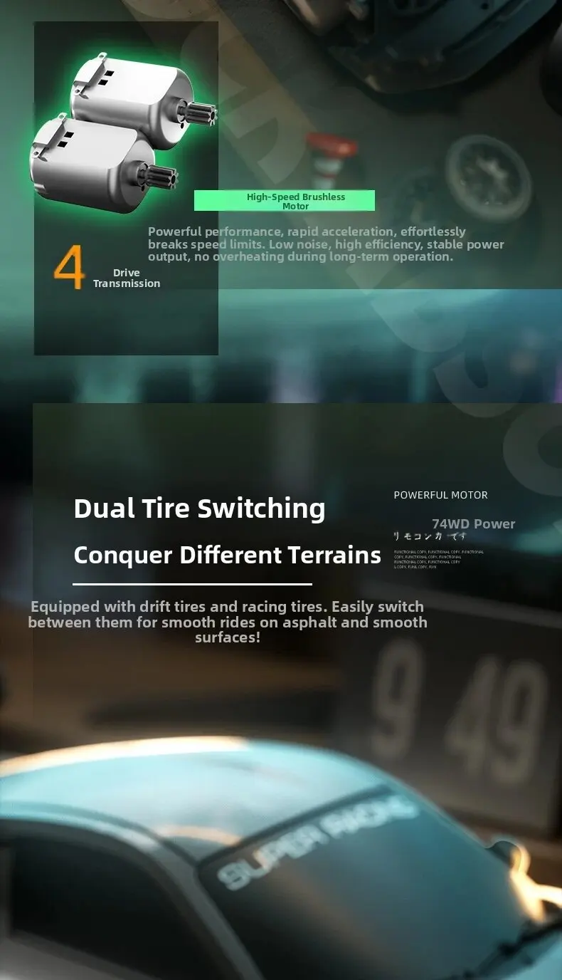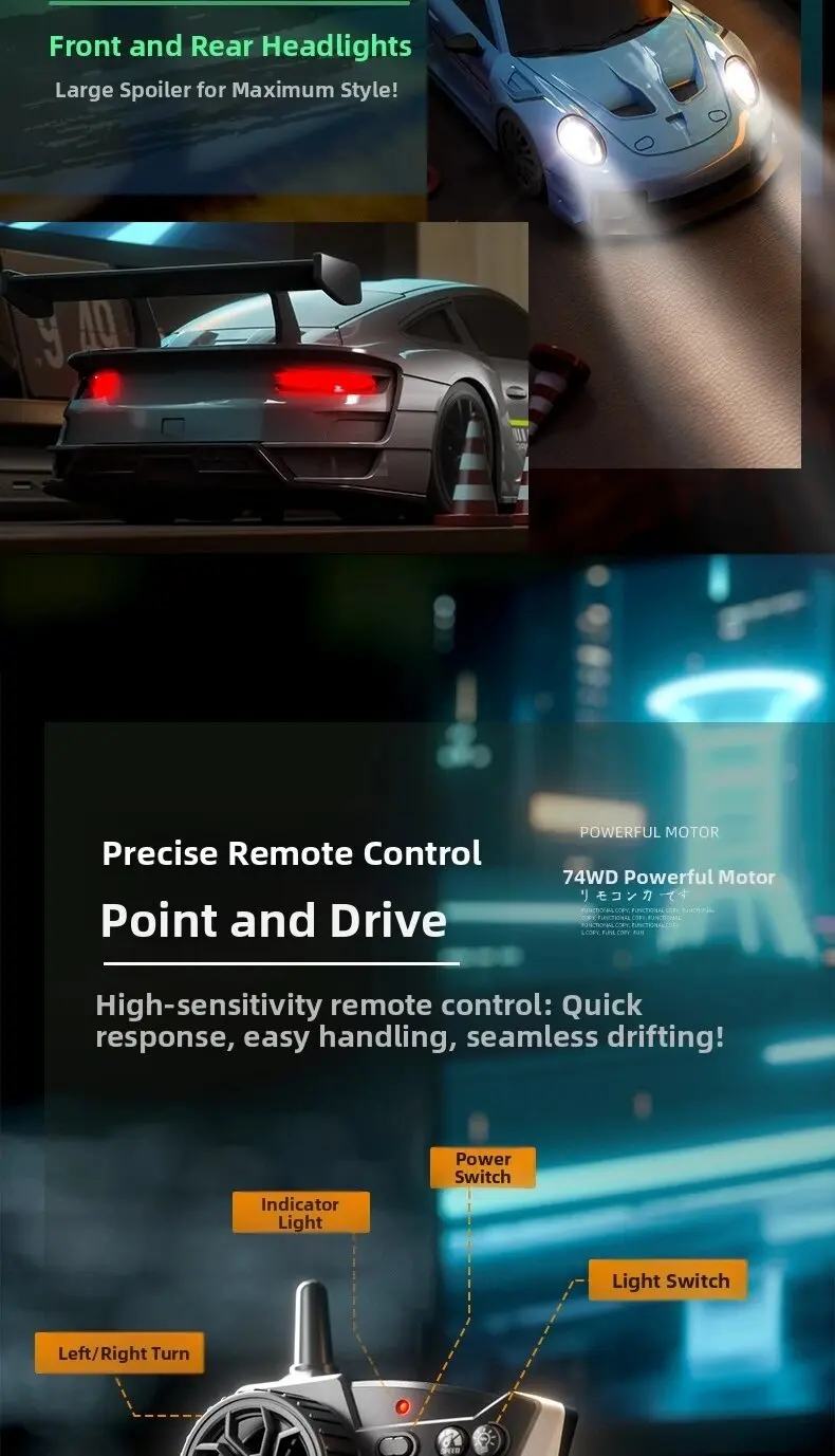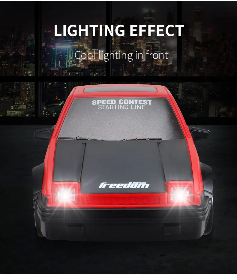 1. Cool car lights, adjustable on and off, rear taillights make night play more exciting2. Four-wheel drive drift, dual-tire switching, two adjustable speeds, smooth and unobstructed play