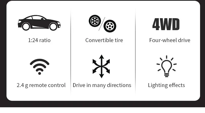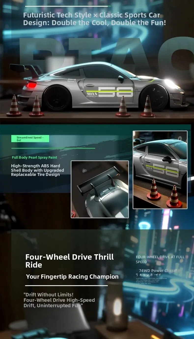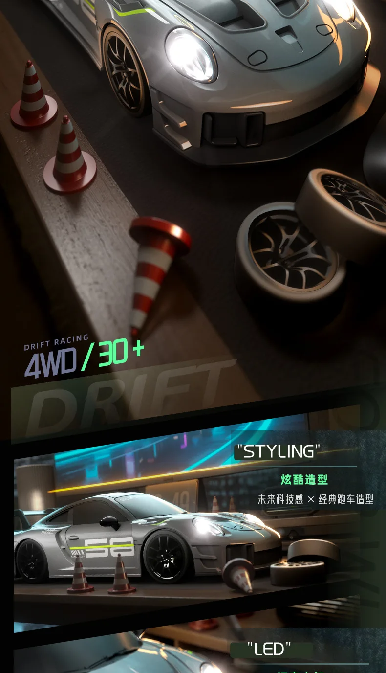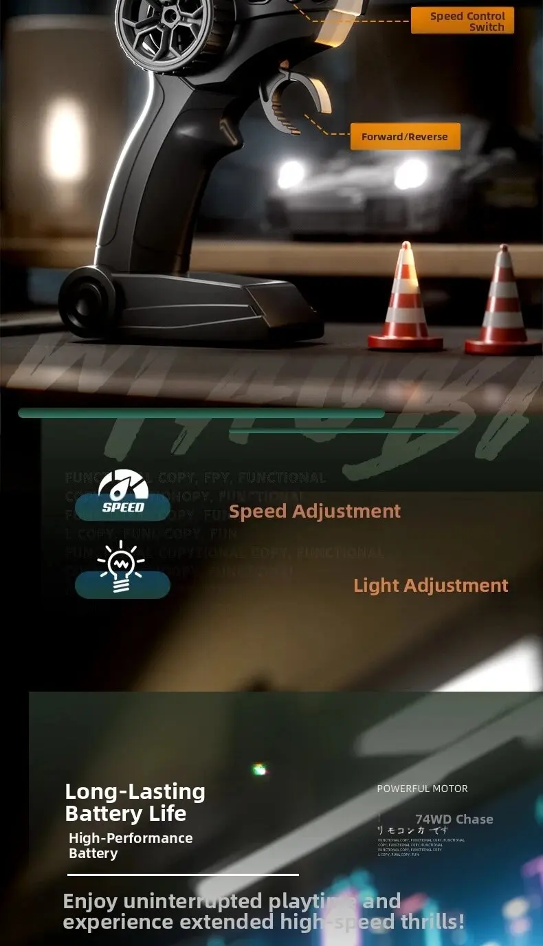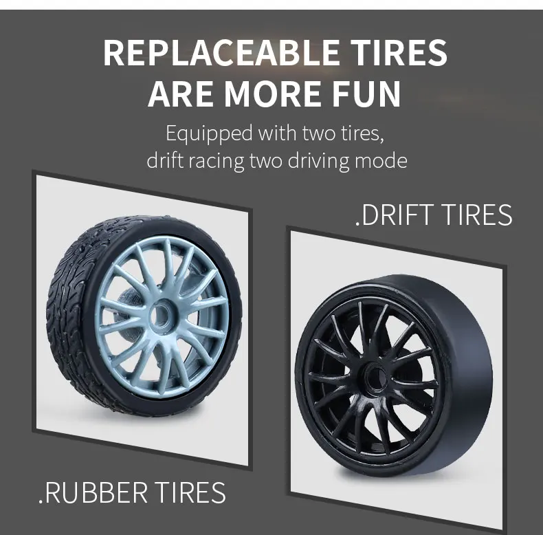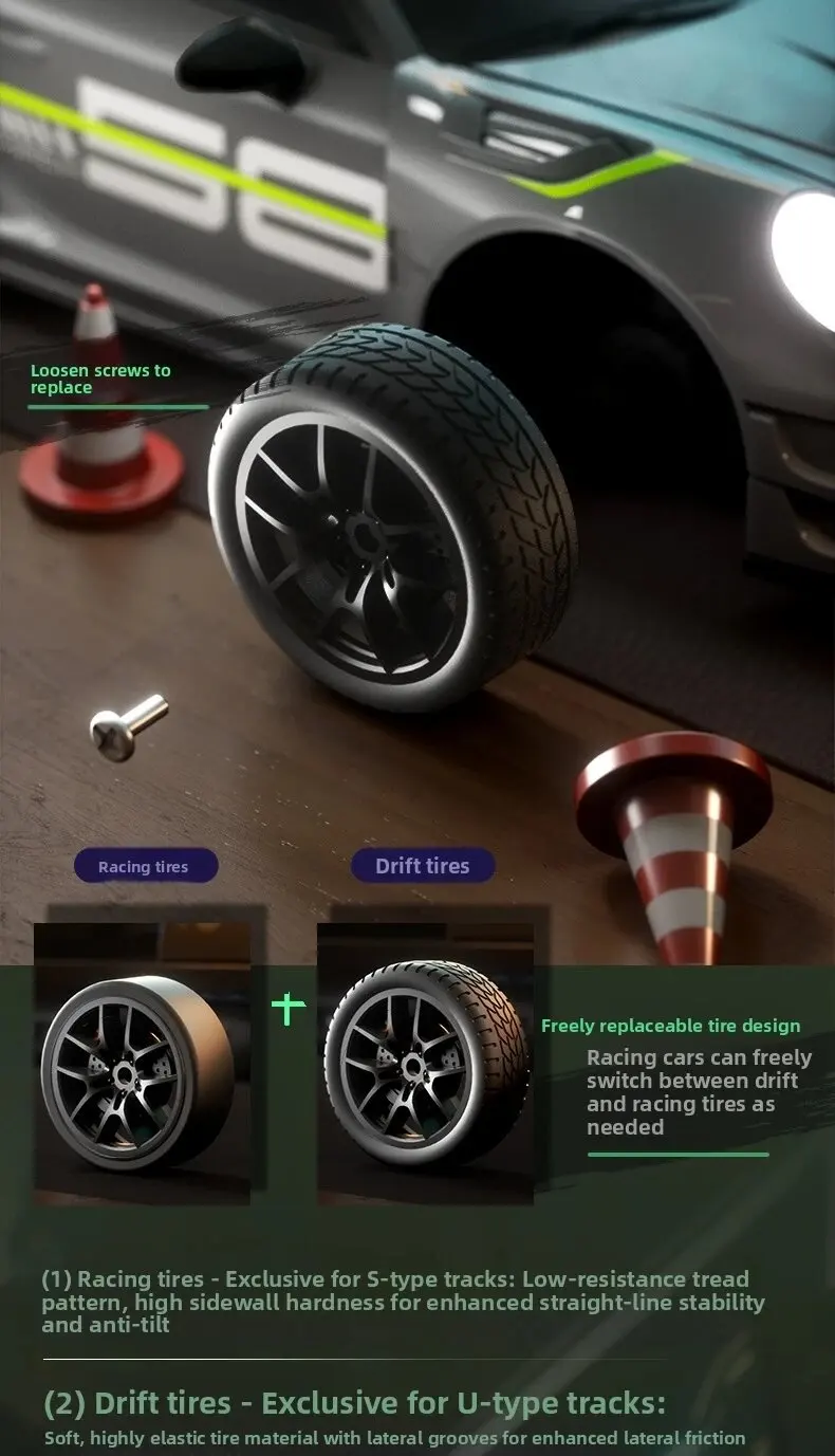 1. Cool car lights, adjustable on and off, rear taillights make night play more exciting2. Four-wheel drive drift, dual-tire switching, two adjustable speeds, smooth and unobstructed play